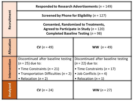 Recruitment included advertisements in local newspapers, campus flyers, internet advertisements, and area physicians. Interested participants were pre-screened with a telephone interview. General entrance criteria included: (1) being an apparently healthy pre-menopausal female between the ages of 18 and 50 years with a body mass index (BMI) greater than 25 kg/m2, (2) not recently participating in an exercise or diet program, and (3) being capable of engaging in exercise training. Those who met the initial qualifications were invited to a familiarization session to receive an explanation of the study, sign consent forms, and complete personal and medical history information. After that, participants were randomly assigned to either: (1) Curves® fitness and weight management program [24] (CV) or (2) Weight Watchers® Momentum™ Program [25] with weekly meetings and encouraged exercise engagement (WW). Figure 2 presents a CONSORT diagram. A total of 149 women responded to research advertisements, 127 women met initial phone screening criteria, and 120 women underwent familiarization. Of these, a total of 98 women consented to participate in the study and 51 women (34.0 ± 6.1 years old, 90.1 ± 14.5 kg, 34.0 ± 5.1 kg/m2, and 46.5 ± 7.1% body fat) completed the study. Time constraint was the primary cause for those who withdrew (n = 22). Study recruitment and completion spanned approximately 24 months.
