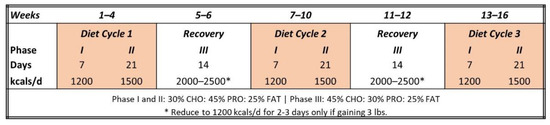 Participants were matched in accord with body mass and BMI, and then randomized into either the CV or WW interventions, in a similar fashion to other studies from our lab [10,12,13,15,16,17,19]. Those in the CV group followed the Curves® Weight Management program as summarized in Figure 3. Participants were instructed to adhere to one-month weight loss cycles that involved consuming 1200 kcals/d for seven days during Phase I and 1500 kcals/d for 21 days during Phase II of the diet plan. During these diet phases, participants were provided meal plans developed by registered dietitians with macronutrient distributions consisting of 30% carbohydrate, 45% protein, and 25% fat. Next, the participants completed a metabolic recovery period (Phase III) in which they were allowed to ingest 2000–2500 kcals/d consisting of 45% carbohydrate, 30% protein, and 25% fat. During Phase III, participants were instructed to monitor body weight and reduce energy intake to 1200 kcals/d for 2–3 days if they experienced a three-pound or greater weight gain. Participants repeated this weight loss cycle three times with the recovery cycle twice, in between during the 16-week intervention. A registered dietitian reviewed the diet and exercise plans with participants prior to the start of the study and monitored compliance weekly to discuss any dietary challenges or concerns. Participants were encouraged to consume a multivitamin with 800 mg of calcium and 520 mg of Omega-3 fatty acids daily during the intervention.