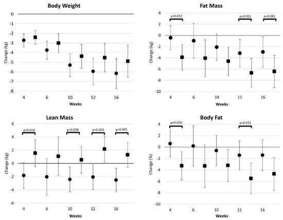 Table S3 provides a summary of body weight and body composition results. Wilks’ Lambda analysis revealed time (p < 0.001) and group × time interaction (p < 0.119) effects were revealed with GLM multivariate analysis of body weight, fat mass, lean mass, bone mineral content, and body fat. Univariate analysis revealed a significant interaction (p = 0.044) between groups in lean mass, with those in the CV group experiencing an increase in lean mass during the study while those in the WW group experienced a reduction in lean mass. Figure 4 presents mean changes with 95% CIs for body composition data. Participants in the CV group observed significantly greater fat mass and percent body fat loss and increases in lean mass during the intervention. After 16 weeks, weight loss was similar between groups (WW −6.1 [−7.8, −4.6], CV −4.9 [−3.2, −6.2] kg, p = 0.264). However, those in the CV group observed greater reductions in fat mass (WW −2.9 [−6.7, −0.2], CV −6.4 [−9.2, −3.6] kg, p = 0.081) and increases in lean mass (WW −2.5 [−4.3, −0.7], CV 1.3 [−0.6, 3.2] kg, p = 0.005) resulting in more favorable changes in percent body fat (WW −1.4 [−4.1, 1.2], CV −4.7 [−7.5, −1.8]%, p = 0.098).