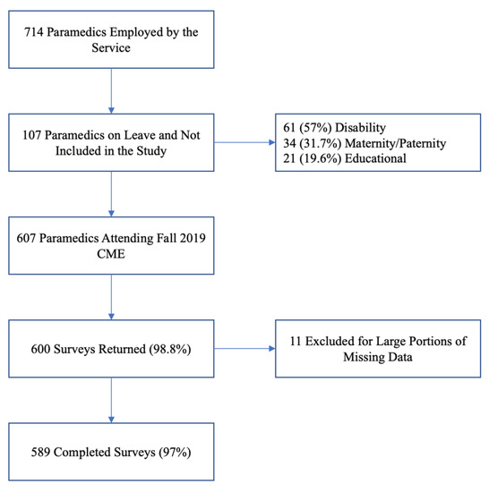 During the CME sessions, a total of 107 paramedics (15% of the total workforce) were on long-term leave (Figure 1). Although we originally intended to distribute surveys to paramedics on leave via postal mail early in the new year, personnel within the service who could have facilitated this stage of recruitment were redeployed in response to the COVID-19 pandemic, and we were unable to contact paramedics on leave.