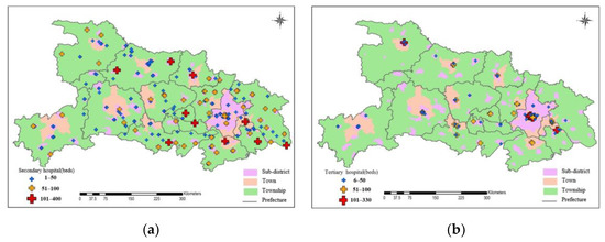The coordinates of 313 secondary hospitals and 108 tertiary hospitals were obtained based on their addresses using the geocoding Application Programming Interface (API) of Baidu Map. As shown in Figure 2, secondary and tertiary hospitals are mostly distributed in towns, with more located in the eastern and central regions than in the western and northern regions. Larger secondary and tertiary hospitals are also mainly distributed in the eastern and central regions. Comparing the spatial pattern of the two levels of hospitals, it can be seen that the distribution of secondary hospitals is more uniform than that of tertiary hospitals.