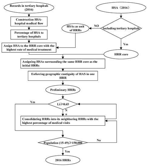 There are three types of hospitals in China: primary hospitals, secondary hospitals, and tertiary hospitals. Among them, secondary hospitals and tertiary hospitals provide professional delivery services, with the medical resource quality of tertiary hospitals being the highest. So, in this study, secondary hospitals correspond to HSAs, and tertiary hospitals correspond to HRRs. The delineation of HRRs is similar to HSAs, however, HRRs need to meet the following conditions: The Li of each HRR is not less than 0.65 [4], and each HRR has a minimum population size, which is 120,000 in the United States. This study uses the average childbearing age population served by each tertiary hospital in Hubei as the minimum population size of each HRR because there is at least one tertiary hospital in an HRR. The specific steps are shown in Figure 3 below: