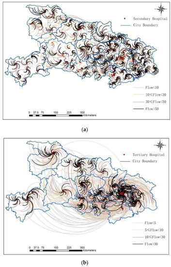 The spatial and scale patterns are different between the secondary and tertiary medical flow (Figure 4). The total number of patients in the third-level medical flow is larger, but on average, each medical flow contains fewer patients than that of secondary hospitals. Among them, 335,231 parturients who went to secondary hospitals for medical treatment formed 13,128 secondary flows, with an average scale of 26, and 230,157 parturients who went to tertiary hospitals for medical treatment formed 12,793 flows, with an average scale of 18. In addition, flows point to secondary hospitals and tertiary hospitals in the western regions were mostly located in municipal administrative units, but a great number of parturients in the central and eastern regions of Hubei chose to seek medical services across city boundaries.