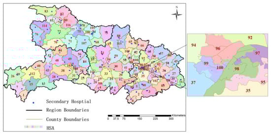 In China, the medical system is divided into three levels [5]. Primary hospitals are responsible for providing comprehensive medical services for the community, such as prevention, rehabilitation and healthcare. Secondary hospitals serve a larger spatial area, provide health services to multiple communities, receive referrals from primary hospitals, and provide technical support for treatment in primary hospitals. Tertiary hospitals are hospitals that provide medical and health services at the prefecture level or across prefectures in some cases, provide specialized medical services, solve critical and difficult diseases, and receive referrals from other hospitals. The administrative division unit is the basic unit for the allocation of medical resources, as well as the basic unit for related research [6]. So, the service area of hospitals is mostly coincidental with the administrative unit to which they belong, which is not determined based on the actual medical behavior of patients. In addition, due to the lack of a medical referral system, many patients will give priority to tertiary hospitals when it is not necessary, which may lead to a waste of medical resources [7].