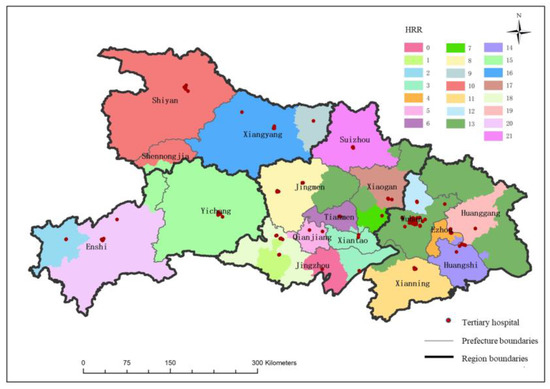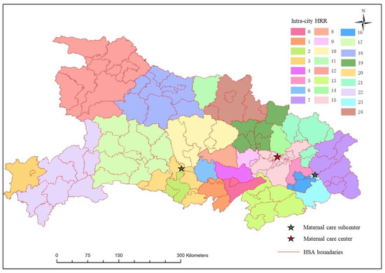 Based on the above research purposes, this study takes the maternal service in Hubei Province as an example. First, the classic Dartmouth method is used to divide HSA and HRR based on the registration data of pregnant women. The HRR is jointly composed of HSAs, and the minimum service population size in each HRR conforms to the actual situation of the study area, rather than directly applying existing empirical indicators. Therefore, HSA and HRR form a two-tier referral system. In addition, according to the characteristics of China’s resource allocation based on administrative divisions as the basic unit, this paper adds the conditions of administrative division into the Dartmouth method. Dividing intra-city HRRs according to cases seeking treatment inside the city they live, and cross-city HRRs based on women seeking treatment across the city. Besides, a cross-city HRR is formed by the merger of intra-city HRRs, these two types of HRRs also meet the same minimum service population size. HSA, intra-city HRR, and cross-city HRR form a three-tier referral system. Finally, this paper compares the similarities and differences between the two referral systems, which not only provides references for China’s medical planning but also provides references for HSA and HRR research in other developing countries.