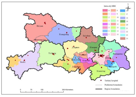 According to the tertiary medical flow inside the cities, Hubei province is divided into 25 intra-city HRRs. Each intra-city HRR contains an average of 4.3 hospitals, including five HRRs with one tertiary hospital, eight HRRs with two tertiary hospitals, four HRRs with three tertiary hospitals, and eight HRRs with four or more tertiary hospitals. The spatial distribution of intra-city HRRs is similar to the classic HRR, the number of intra-city HRRs in the eastern and central regions is greater but they are smaller than those in the western and northern regions. However, the layouts of the classic HRR and intra-city HRR also have differences. The intra-city HRRs have no super-large unit like No. 13 among the classic HRRs. In addition, the boundaries of intra-city HRR are more in accordance with city boundaries. Such a distribution pattern is convenient for health management departments to supervise and manage healthcare facilities.