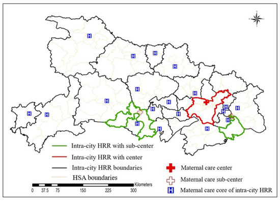 In previous studies, most hierarchical medical systems had a two-tier structure, consisting of HSAs and HRRs. This study proposes to use HSA, intra-city HRR, and cross-city HRR based on the actual maternal data of Hubei, forming a three-tier maternal hierarchical medical system. However, there is only one cross-city HRR in Hubei Province, and its core region of maternal care is the intra-city HRR in south Wuhan (Figure 8). This means, when necessary, women in remote areas of northern and western Hubei must travel more time when they are referred to Wuhan, and treatment may be delayed. The intra-city HRR in south Wuhan is the core area of the cross-city HRR. It is the most developed area with the highest density population in Hubei Province. Therefore, hospitals in this region do not only provide services for local puerperas, but also for a large number of pregnant women from other regions of Hubei, causing major pressure on maternal services.