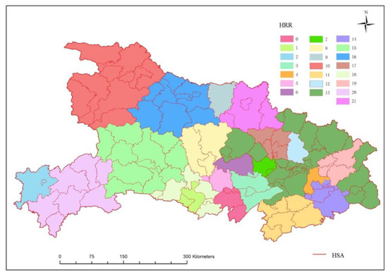 Based on the Dartmouth HRR method, a total of 22 HRRs have been delineated in Hubei Province (Figure 6). Each HRR has an average of 4.9 hospitals. Among them, three HRRs have one tertiary hospital, five HRRs have two tertiary hospitals, five HRRs have three tertiary hospitals, and nine HRRs have four or more tertiary hospitals. The average number of patients served in each HRR is about 10,461. It can be seen from Figure 6 that there are only three HRRs in the western and northern regions of Hubei, each HRR covers a large area; there are more HRRs in the eastern and central regions of Hubei than in northern and western Hubei, the average coverage of each HRR is also relatively small. In addition to the Shennongjia forest area and the southern part of Wuhan, the boundaries of the HRRs of other tertiary hospitals overlap with city boundaries to a high degree. For example, the No. 13 HRR contains 35 tertiary hospitals in southern Wuhan. This HRR serves a large area and crosses the city boundary. It not only covers the southern part of Wuhan, but also covers some cities, such as Jingmen, Huanggang, Huangshi, and Xianning. However, in China, the administrative division unit is important for resource allocation, so if this kind of HRR is put into use it will greatly increase the management cost.