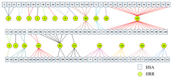 The two-tier maternal service referral system is composed of classic Dartmouth HRR and HSA. A total of 117 HSAs and 22 HRRs were identified in Hubei Province using the Dartmouth method, forming a total of 106 referral routes, that is, the patient can be referred to the corresponding HRR when utilizing healthcare services in HSAs within the HRR. The spatial distribution of the referral system and the referral relationship between HRR and HSA are shown in Figure 9 and Figure 10. It can be seen that the number of HSAs served by most HRRs does not exceed 10, and the 13th HRR corresponds to the most HSAs with a total of 27.