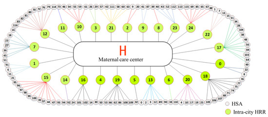 Considering the administrative divisions, the three-level referral system consists of HSAs, intra-city HRRs, and one cross-city HRR (Figure 11). That means, the puerperas first go to an HSA for maternal care services, and if necessary, the patients are referred to an intra-city HRR or provincial maternal service center. The patients who are referred to the intra-city HRRs can also be referred to a provincial maternal service center. This referral system has 113 referral paths between HSA and intra-city HRR and 25 paths between intra-city HRR and cross-city HRR, as shown in Figure 12. The number of HSAs corresponding to each intra-city HRR in the three-tier referral system is more than that of the two-tier system. In future planning, if the crowdedness in the maternal care center is too high, the sub-centers can be allocated refer to the locations in Figure 11.