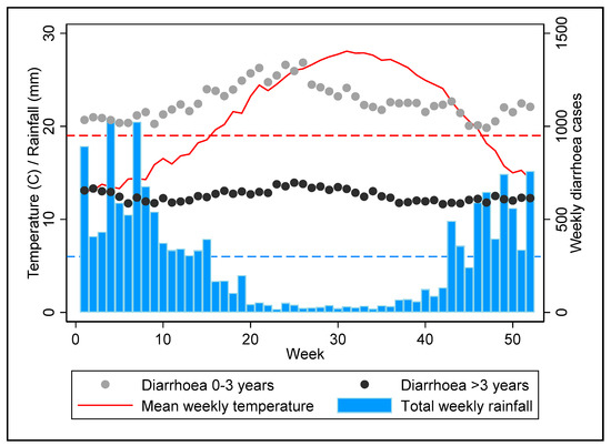 Poisson time-series regression models were used to assess acute associations between weekly diarrhoea cases and mean weekly ambient temperature and total weekly rainfall. A series of cubic-spline functions of time were used to flexibly model underlying trends and seasonal patterns in the health data unrelated to climate factors. Seasonally-adjusted models used a scale parameter to allow for overdispersion and model residuals were lagged by one week to adjust for significant residual autocorrelation associated with the week before.