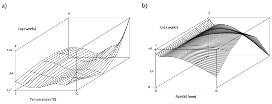Seasonally adjusted relationship between (a) temperature and (b) rainfall with relative risk of diarrhoea presentation in the 0–3-year age-group.