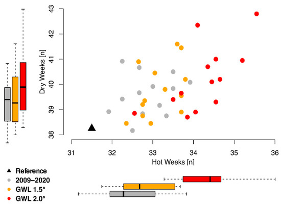 Annual average number of hot (temperature > 19 °C) and dry (rainfall < 6 mm) weeks under current and future climate. The corresponding number of weeks are shown for the reference data (ERA5, black triangle), as well as the applied climate models for the reference period 2009–2020 (grey) and the two Global Warming Level (GWL) targets of 1.5 °C (orange) and 2.0 °C (red). Outside boxplots refer to the spread of the climate models for hot and dry weeks (x and y-axis) separately under the different time periods/warming levels.