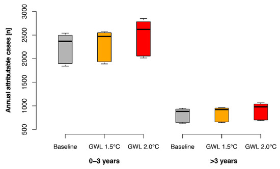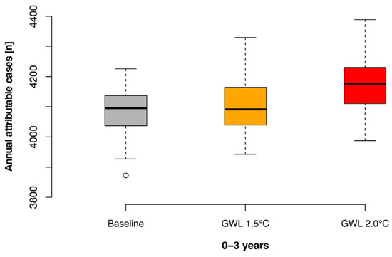 We project an annual average of 2446 heat attributable cases in the 0–3-year age-group under a 2 °C global warming level, which amounts to a 10.7% increase from modelled baseline levels (reference period 2009–2020). However, this increase would be limited to only 1.8% under a 1.5 °C scenario. For the >3-year age-group, rises of 1.8% and 10.9% are projected under the 1.5 °C and 2 °C scenarios, respectively, from a much lower baseline. The boxplots in Figure 5 show the distributions of annual number of heat attributable diarrhoea cases across the 13 climate models at baseline and for each warming level. The distributions of projections across the climate models were highly negatively skewed.