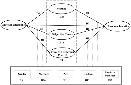 Purchase frequency moderates the relations between attitude and purchase intention (H13a); subjective norms and purchase intention (H13b); perceived behavior control and purchase intention (H13c); emotional response and attitude (H13d); emotional response and subjective norms (H13e); emotional response and perceived behavior control (H13f); and emotional response and purchase intention (H13g).