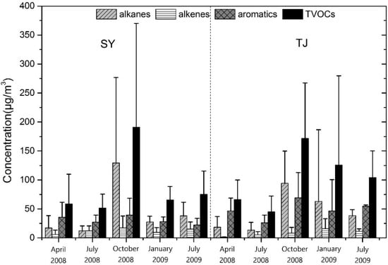 - Hsieh, C.C.; Tsai, J.H. VOC concentration characteristics in Southern Taiwan. Chemosphere 2003, 50, 545–556. [Google Scholar] [CrossRef]