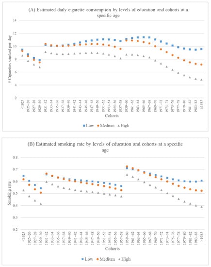 Figure 2 visualizes the above findings regarding changing educational gaps across cohorts. It displays predicted daily cigarette consumption (Panels A) and rate of smoking (Panels B) at a specific age for men with different levels of education in all 32 cohorts. The prediction is based on Models 3 and 6 in Table 2. Both panels reveal that among those born after 1960, smoking behavior declined from older to younger cohorts, but the decline was steeper in men with higher levels of education than those with low education, leading to widening educational gaps. Most importantly, among the post-1980 cohorts, the declining trend stalled and possibly reversed for low-education men, but continued for those with medium or high education. As a result, the divergence in smoking behavior among men with different education levels became the starkest among these cohorts. This study is the first to identify widening inter-cohort educational gaps in smoking, which became especially amplified among the post-1980 cohorts.