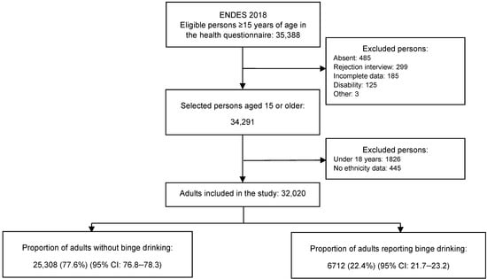 Regarding the sample size, a total of 32,020 people were included in the analysis. Among the inclusion criteria, people aged 18 years or older, with complete information on alcohol consumption in the last 30 days, and complete data on the health questionnaire were considered. Among the exclusion criteria, the reasons for which the participants could not carry out the survey were considered (absence, rejection of the interview, incomplete data, disability, among others). Finally, a total of 6712 people with binge drinking were determined, which is equivalent to 22.4% of the entire population included in the analysis (Figure 1).