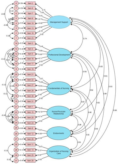 Other studies used a six-factor model similar to ours, characterized by Management Support, Professional Development, Nursing Fundamentals, Nurse–Doctor Relationship, Staffing, and Organization of Nursing Care [41,43]. As for the number of items, other studies also presented comparable scales to the one in the present study [6,38,40,41].