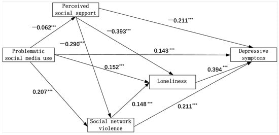 | 3. Problematic social media use → Perceived social support → Social media violence → Loneliness → Depressive symptoms | 0.001 | 0.001, 0.001 | 0.008 | 0.350 |