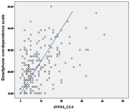 The correlation between the dYFAS-C2.0 and Smartphone Overdependence Scale scores was analyzed. The dYFAS-C2.0 and Smartphone Overdependence Scale scores were significantly correlated after adjusting for age, sex, BMI percentile, and SES (r = 0.428, p < 0.001; Figure 1). This relationship remained significant after multiple linear regression analyses (age, sex, BMI percentile, and SES were corrected; B = 0.426, p < 0.001).