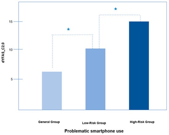 Differences of food addiction by problematic smartphone use severity. Abbreviation: dYFAS_C2.0 scale: dimensional Yale Food Addiction Scale for Children 2.0. *: p-value < 0.05. In the case of high-risk smartphone addiction, food addiction also increased. and the difference was significant for each group when adjusting for age, gender, socioeconomic status (SES), and body mass index (BMI) percentile (F = 13.419, p < 0.001).