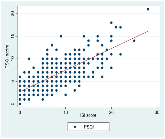 Shows the correlation between PSQI and ISI (r = 0.76, p < 0.001).