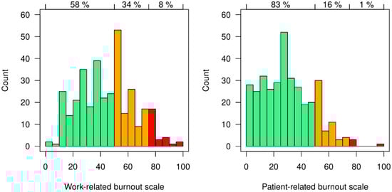 According to Kristensen et al. [34], work-related burnout is defined as “the scale of physical and psychological fatigue perceived by a person in connection with their work”. The work-related burnout scale helps to identify people who are tired and attribute this tiredness to work-related factors and not to other factors, such as health problems or family responsibilities. Client-related or patient-related burnout is defined as “the scale of physical and psychological fatigue perceived by a person in connection with their work with clients”.