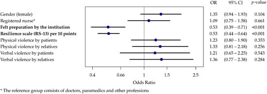 Furthermore, where employees felt well prepared by their workplace for potential attacks, this was negatively associated with burnout risk and high perceived stress. In a study on violent attacks against healthcare workers from 2019, preparation by the workplace for potential attacks was also shown to be a significant protective factor against high perceived stress [1]. High resilience is also in negative correlation to burnout in our study, thus supporting the results of various studies [23,33] that showed that lower or moderate resilience was associated with higher burnout values.