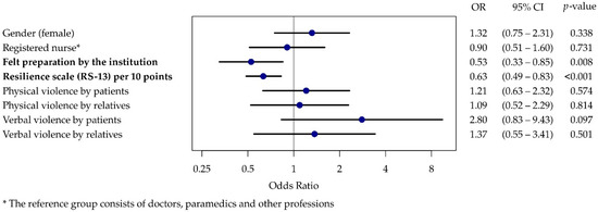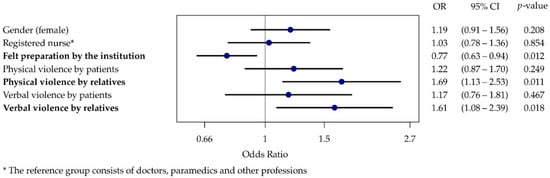 Based on the results from the ordinal regression, there was no statistically significant correlation between patient violence and high perceived stress (H1c and H3c). The hypotheses (H2c and H4c) that verbal and physical violence from relatives posed a risk factor (OR 1.69, 95% CI 1.13–2.53 and OR 1.61, 95% CI 1.08–2.39) for high levels of perceived stress were, however, confirmed on the basis of these results. The hypothesis (H5c) that good preparation by the institutions has a protective effect (OR 0.77, 95% CI 0.63–0.94) was also confirmed (Figure 4).