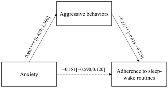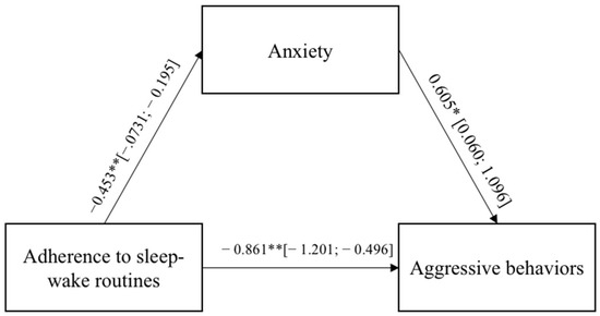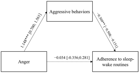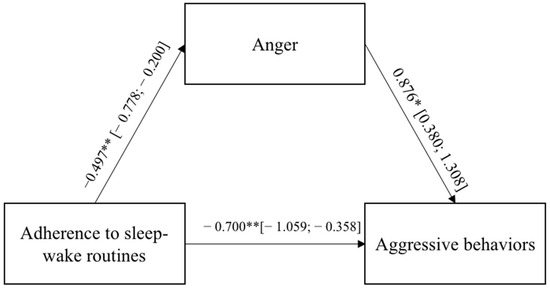In both models, the direct paths between the adults’ adherence to the sleep–wake routines and the aggressive behaviors were significant and negative, indicating that a low adherence to the sleep–wake routines led to externalizing more aggressive behaviors toward the self and others. The adults’ adherence to the sleep–wake routines were significantly and negatively related to the negative emotional states of anxiety and anger, which, in turn, were significantly and positively associated with aggressive behaviors. Figure 1 and Figure 2 report the regression coefficients and bootstrap intervals of confidence.