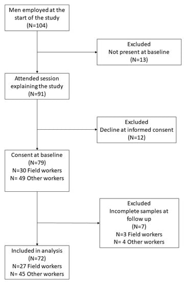 According to company records, 104 men and 2 women were employed at the start of the study. In February 2018, we extended an invitation for an informational session attended by 91 men and 2 women. For the study, 80 men and 1 woman provided informed consent. At the end of the study, the only woman and 8 men (3 field workers and 5 other workers) had incomplete biomarker samples, leaving a total of 72 men in the final analysis (Figure 1) who were demographically similar to the 79 men with baseline samples (Table S1, Supplemental Material).