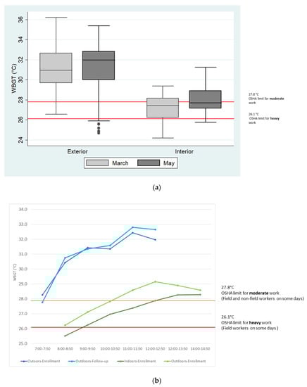 For field workers, shifts were 6:00 a.m.–1:00 p.m., with lunch at noon, usually under a tree or tin roof. Median WBGT between 7:00 a.m. and 12:50 p.m. outdoors in March and May were 31.1 °C and 32.2 °C. Indoor shifts generally lasted from 8:00 a.m.–5:00 p.m., with a lunch break. Median WBGT indoors between 8:00 a.m.–2:50 p.m. were 27.4 °C and 27.7 °C. Maximum WBGT’s in March and May outdoors were 36.2 °C and 35.4 °C compared to 29.4 °C and 31.3 °C indoors. Field workers were above recommended limits for most of the shift during both moderate and heavy work, whereas other workers were above limits for part of the day when they were performing moderate (rather than low) work (Figure 2).