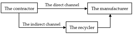 In the direct channel model, the contractor directly recycles the waste generated on the construction site, and sells the recycled materials to the manufacturer for reproduction. After remanufacturing, the manufacturer puts the second-class renewable building materials into the market. The decision-making process is as follows: the contractor first determines the price of the recycled materials, and then the manufacturer determines the price of the second-class renewable building materials.