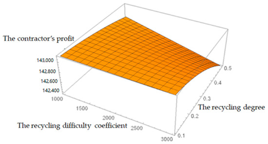 Figure 4. Effects of recycling difficulty coefficient and the recycling degree on the contractor’s profit.