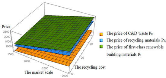 From Figure 5 and Figure 6, we can know that the price and profit increase with the increase in the market scale of renewable building materials. The increase in the market scale of renewable building materials means the increase in the consumers’ WTP (willingness to pay) of renewable products. The growing public awareness of environmental protection will boost demand for the renewable products, and the purchase of renewable building materials will increase. However, these hardly change with the recycling cost and the curve trend is mostly stable. It can be seen that for recyclers, due to advanced technology and professionalism, the change in recycling cost has little impact on price and profit. The increase in market scale of renewable building materials will attract and encourage more enterprises to participate in C&D waste recycling activities.