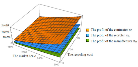 Figure 6. Effects of the market scale and the recycling cost on the profits.
