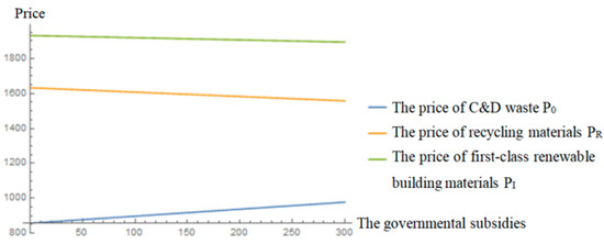 From Theorems 3–5, we can conclude that governmental intervention is very feasible and effective. The governmental incentive subsidy increases the profits of all the supply-chain members, and also stimulates the enthusiasm of enterprises to participate in the recycling activities of C&D waste. It also reduces the retail price of renewable building materials, which benefits the majority of consumers. Additionally, the recycling amount of C&D waste increases when the governmental intervention exists, which contributes to environmental protection!