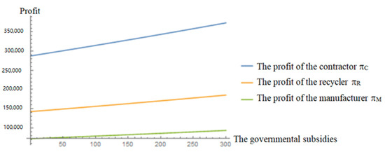 Figure 7 and Figure 8 both reflect that with the increase in governmental subsidies, the retail price of renewable building materials will decrease smoothly, which means consumers can pay less, and the demand for renewable building materials will increase. The rising demand for renewable building materials will accelerate the process of C&D waste recycling, and as a result, the recycling amount of C&D waste will be increased. At the same time, with the increase in subsidies, the profits of the three parties will increase. It can be seen that governmental subsidies can simultaneously contribute to environmental protection and increased social welfare. In addition, from Figure 8, it can be seen that the profit of the contractor is always the largest and its sensitivity to government subsidies is the highest, which indicates that the contractor is more willing to entrust recycling to the recycler when governmental subsidies are increasing, which once again proves that the governmental incentive policy is very feasible and effective.