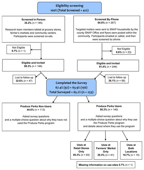 We used a six-item screener to determine eligibility for this cross-sectional survey. Screener questions were asked by a trained research assistant in person or over the phone. Individuals were eligible if they were: (1) currently receiving SNAP benefits; (2) residing within the defined study boundaries; (3) responsible for at least half of the food shopping for their household; (4) ≥18 years of age; (5) English-speaking; and (6) the only member of their household enrolled in the study. To determine whether a potential participant resided within the defined study boundaries, they were asked to provide their home address, which was then entered into ArcGIS to confirm that it was within the study boundaries. If a participant did not want to provide an address or the address provided was outside of the study boundaries, they were not eligible for the study. Those who were eligible were offered more information on the study, as well as an opportunity to provide consent. We screened 412 people for eligibility, of whom 145 (35.2%) were screened at the in-person events and 267 (64.8%) were screened by phone (Figure 1). Most of those screened were eligible for the study (99.3% of those screened in person and 91.4% of those screened on the phone). We invited 388 people who were eligible to participate and 253 completed the survey (65.2%). About one-third of those eligible did not complete the survey, whether they were screened in person (32.6%) or by phone (36.1%). Prior to completing the survey, study participants provided informed consent in writing (if in person) or verbally (if over the phone).