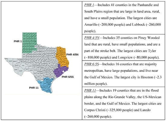 - Texas Department of State Health Services Texas Public Health Regions. Available online: https://www.dshs.texas.gov/regions/state.shtm (accessed on 11 November 2021).