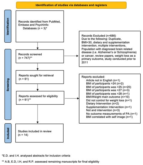 Inclusion criteria consisted of articles originally published in English between the years 2011 and 2021 with average participant BMI reported over 30 kg/m2. Studies that included participants with an average BMI < 30 kg/m2 were excluded. Studies that included BMI change or weight loss as the main outcome were excluded, along with studies that did not control for weight loss. Studies with dietary and/or supplemental interventions were also excluded.