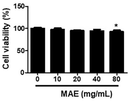 To investigate the effects of MAE on cell viability, WST analysis was performed in THP-1 after treatment of MAE by various concentrations (10–80 mg/mL). Cells did not show significant cytotoxicity in the range of 10–40 mg/mL of MAE while the cell viability declined when the cells were treated with 80 mg/mL of MAE (Figure 1).