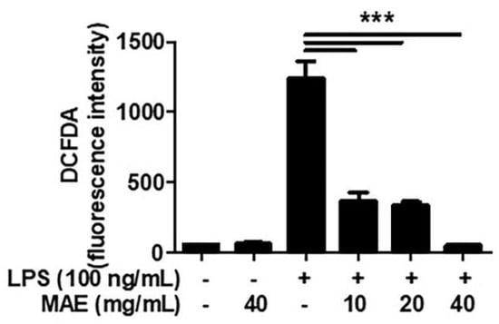 Hence, MAE was used with 10, 20, and 40 mg/mL which proved to be non-cytotoxic. Next, we performed flow cytometry analysis to investigate whether MAE inhibits the increase in ROS by treatment with lipopolysaccharide (LPS), which is the richest component in the cell wall of Gram-negative germs. Results showed that LPS-induced ROS production was decreased in a dose-dependent manner when cells were pretreated with 10–40 mg/mL of MAE (Figure 2).