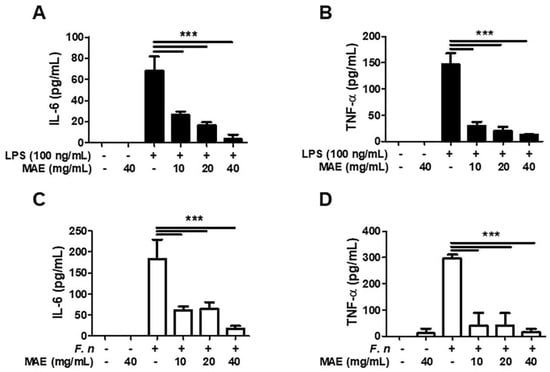 The effect of MAE inhibiting generation of cytokines in THP-1 cells stimulated by LPS/F. nucleatum. THP-1 was pretreated with different concentrations of MAE for 2 h and stimulated by either LPS (100 ng/mL) or F. nucleatum (MOI 10) for 24 h. The concentrations of IL-6 (A,C) and TNF-α (B,D) were measured by ELISA in the culture supernatant. The data were analyzed using one-way ANOVA. *** p < 0.001.