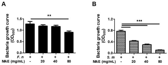 The effect of MAE in inhibiting growth of both F. nucleatum and S. mutans. MAE (0, 20, 40, and 80 mg/mL) was added in BHI liquid media, F. nucleatem (A) was inoculated (1 × 107 bacteria), and it was cultured for 24 h. S. mutans (B) was inoculated (1 × 107 bacteria) and it was cultured for 12 h. The absorbance was measured by optical density. The data were analyzed using a one-way ANOVA. ** p < 0.01, *** p < 0.001.