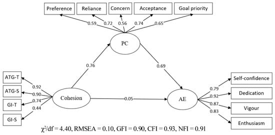 In the mediating effect model (Figure 1), cohesion significantly predicted psychological collectivism (PC) (β = 0.76, p < 0.01) and psychological collectivism significantly predicted athlete engagement (AE) (β = 0.69, p < 0.01), indicating that an indirect effect exists on the path of psychological collectivism in cohesion and athlete engagement, and the effect value is 0.76 × 0.69 = 0.52; thus, H2 is verified.