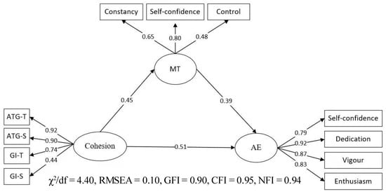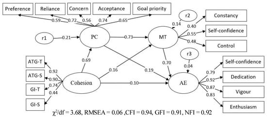In terms of the literature review, we found that the development of mental toughness involves several unique mechanisms that operate together over a long period of time and through unique developmental stages []. In addition to psychological skills and strategies, features relating to the motivational climate, external assets (i.e., coaches, peers, parents, senior athletes, sport psychologists, team-mates) [,,,], and both sport and non-sport related developmental experiences were discussed as the most important mechanisms. Jones (2006) summarized a mental toughness theory and divided the process of mental toughness into three stages: mental toughness behavior is controlled by mental toughness thinking, and mental toughness thinking is influenced by environment and personality. By looking at the variables of this study, cohesion and psychological collectivism falls under the mental toughness environment, including the motivation climate and external assets, whereas athlete engagement can fit under mental toughness behavior. Similar findings revealed that cohesion can significantly affect the formation of mental toughness with a sport-specific sample of college athletes [].