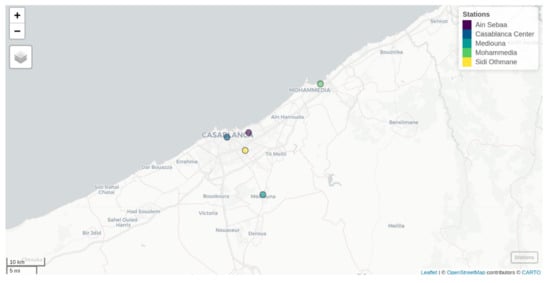 Data on daily confirmed COVID-19 at Casablanca region for the period of 2 March 2020, to 31 December 2020, was collected from the Ministry of Health of Morocco. Daily meteorological parameters and daily air quality parameters for the same period were obtained from the General Directorate of Meteorology (GDM) of Morocco. The daily meteorological parameters included in this study were: temperature (°C); humidity (%); precipitation (mm); wind (m/s); and total duration of the insolation (exposure to the sun) (h). The air quality parameters used in this study included: sulfur dioxide (S02, µg/m3); nitrogen fioxide (NO2); suspended particulate matter with an aerodynamic diameter of less than 10μm (PM10); varbon monoxide (CO); and ozone (O3). The air quality parameters, for the study period, were measured in five monitoring stations set up in the Casablanca region (Figure 1). The five stations were selected among all the existing stations because of the data availability. Every station is a background one. It monitors five air pollution indicators: SO2, NO2, O3, CO, and PM10. Sampling and measurement are performed instantly using automatic devices that automatically introduce the gas sample and record the output. These devices are referred to as continuous analyzers. The recorded outputs are then averaged every 15 min and archived in the air quality database. At the GDM, the control of air quality data is performed according to the rules and recommendations from the Agency for the Environment and Energy Management []. It is carried out according to two main stages: (1) the automatic prevalidation that is a systemic process performed, according to special rules, at the level of the measuring device, the acquisition system, and the central concentration station; and (2) the expert validation by a qualified person according to two mandatory steps. The first step is the technical validation, which consists of checking the conformity of the whole measuring system. The second step is the environmental validation which consists of a cross-sectional investigation of the relevance and consistency of the obtained data. As for meteorological data control, it is carried out at the GDM according to the recommendations of the WMO to National Meteorological and Hydrological Services []. Overall, to ensure data quality, the GDM adopts a clear process in the framework of its ISO 9001 certified management system. The process proactively prevents potential risks that could cause data quality deterioration, with a well-designed climate data management system and well-trained personnel aware of data quality culture. After collecting the data, data experts at the GDM identify and formulate data problems and implement corrective actions, through regular reviews and continuous improvement processes. Missing data for the whole data series were imputed by the mean of the observed values per day for each indicator.