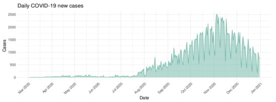 Time series distribution of daily COVID-19 confirmed cases in Casablanca region (from 2 March 2020 to 31 December 2020).